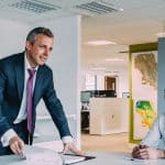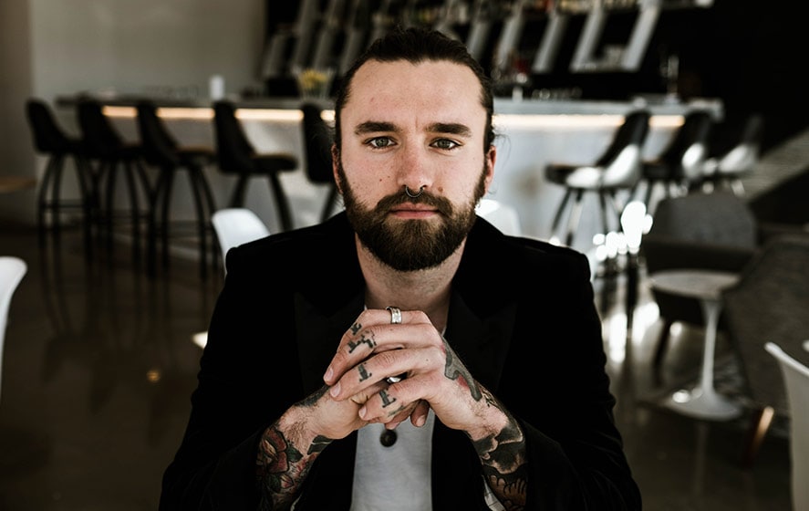 A confident man with tattoos and a beard, dressed in smart casual, sitting in a modern, stylish office environment with an open-plan design.