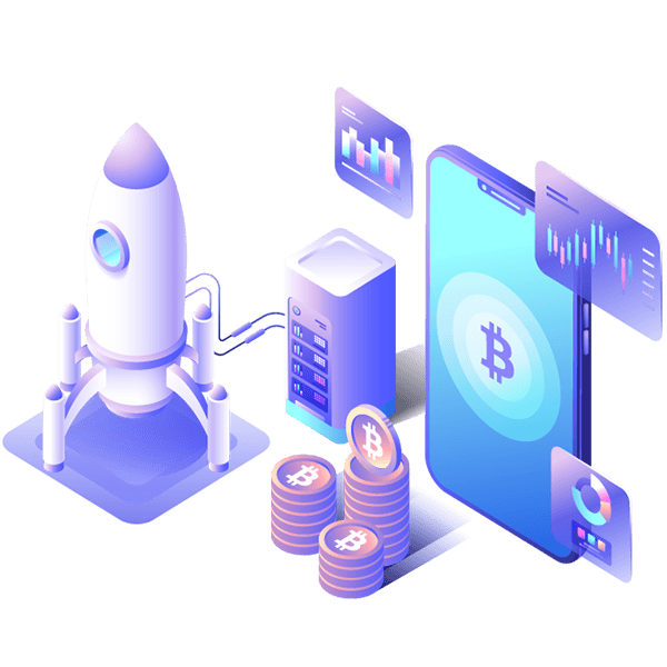 A modern digital illustration of a rocket, Bitcoin coins, servers, and financial data charts symbolising cryptocurrency trading and blockchain innovation.