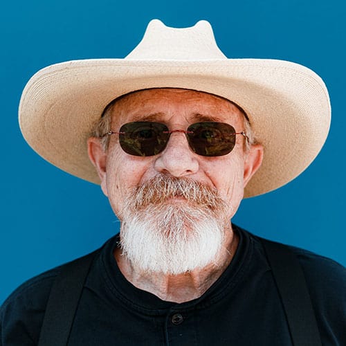 Casual man with white beard wearing a wide-brimmed hat and sunglasses against a blue background.