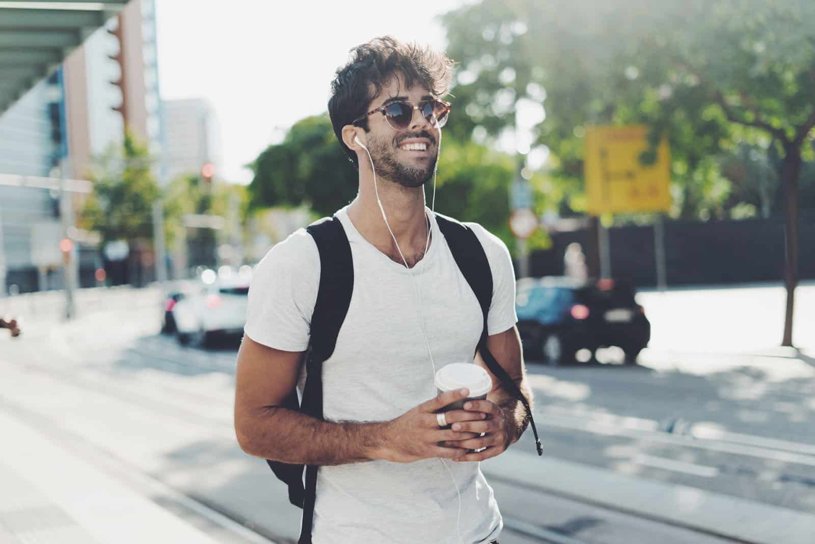 A man smiling with sunglasses, backpack, and coffee in an urban environment on a sunny day.