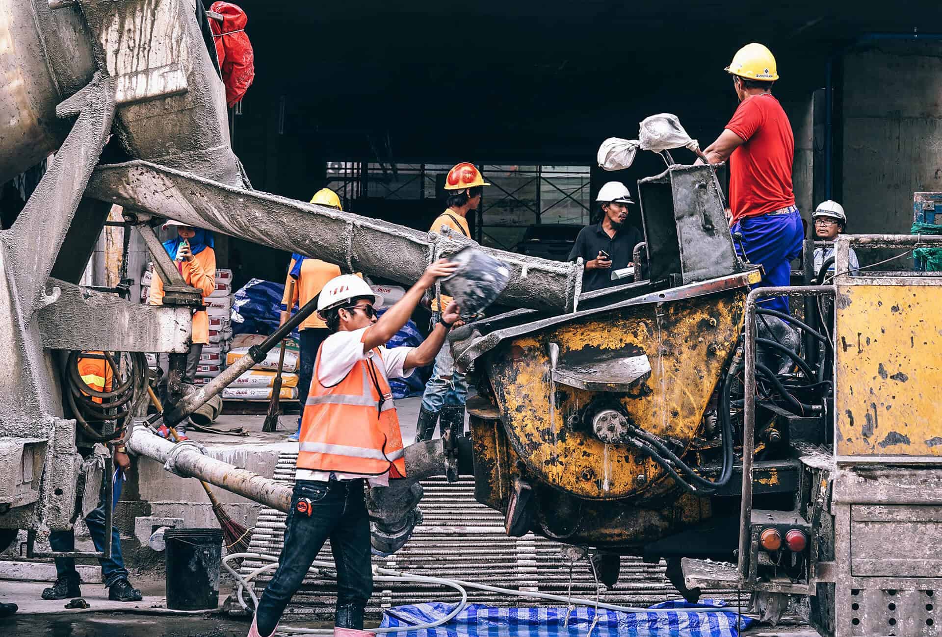 Cement pouring at construction site with workers using concrete pump for building infrastructure.