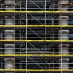Workers in safety helmets and vests operate concrete pump at construction site for building infrastructure.