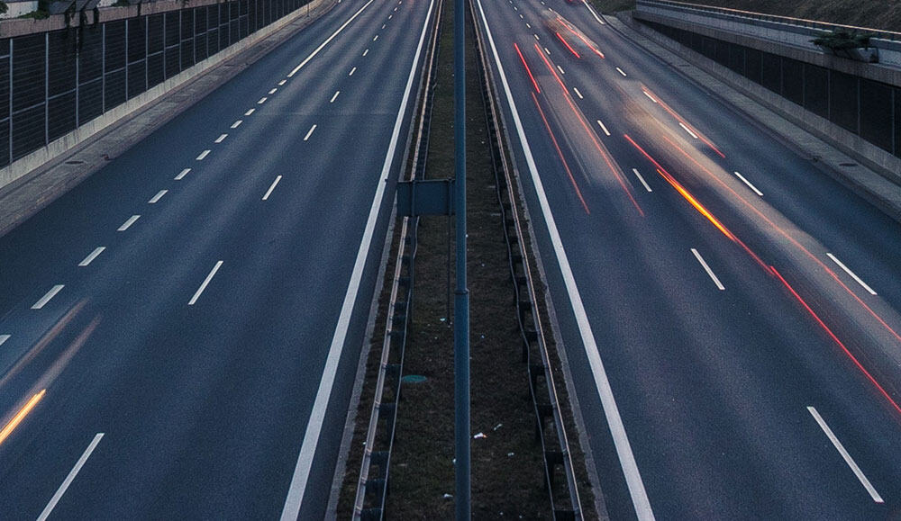 The image depicts a sleek, modern dual carriageway with light trails from vehicles, symbolising efficient transportation and road infrastructure.