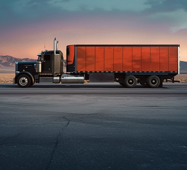 A large semi-truck travelling on an open highway at sunset, showcasing modern transport solutions by CAJA Group.
