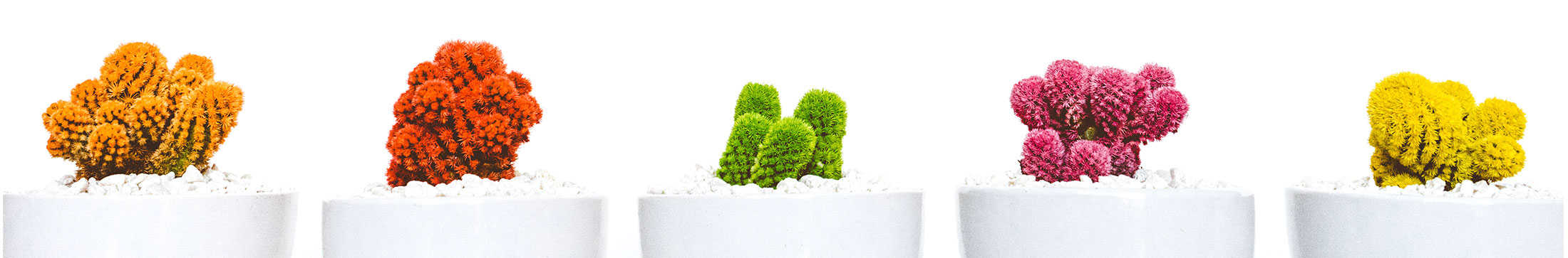 Bright colourful cacti in white pots, showcasing succulent plant variety for landscaping or decoration.
