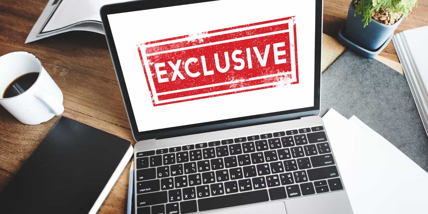 A modern workspace featuring a laptop showing an “Exclusive” message, alongside coffee and office supplies, ideal for business exclusivity and premium service visuals.