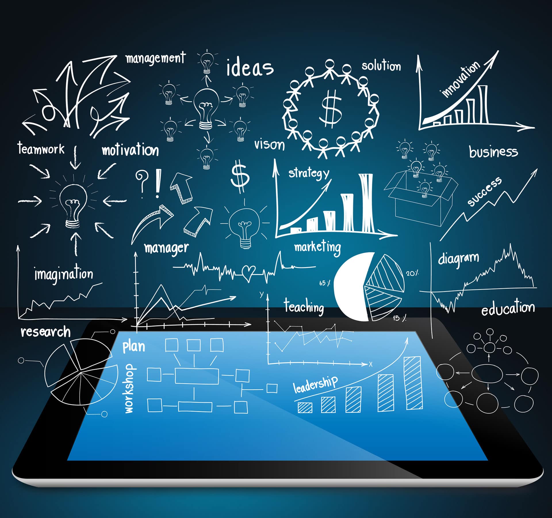 This image features a tablet with business strategy diagrams, charts, and keywords like leadership, marketing, and research, emphasizing business development.
