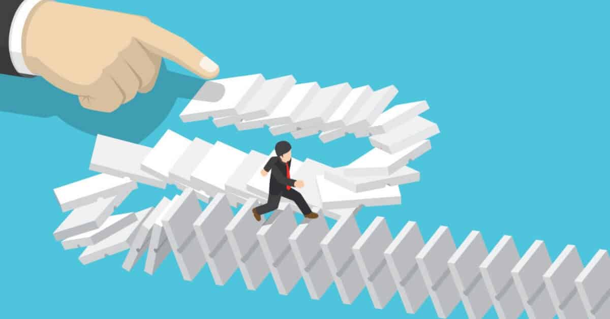 Illustration of a businessman walking on a domino chain symbolising business risk, decision making, and strategic planning.