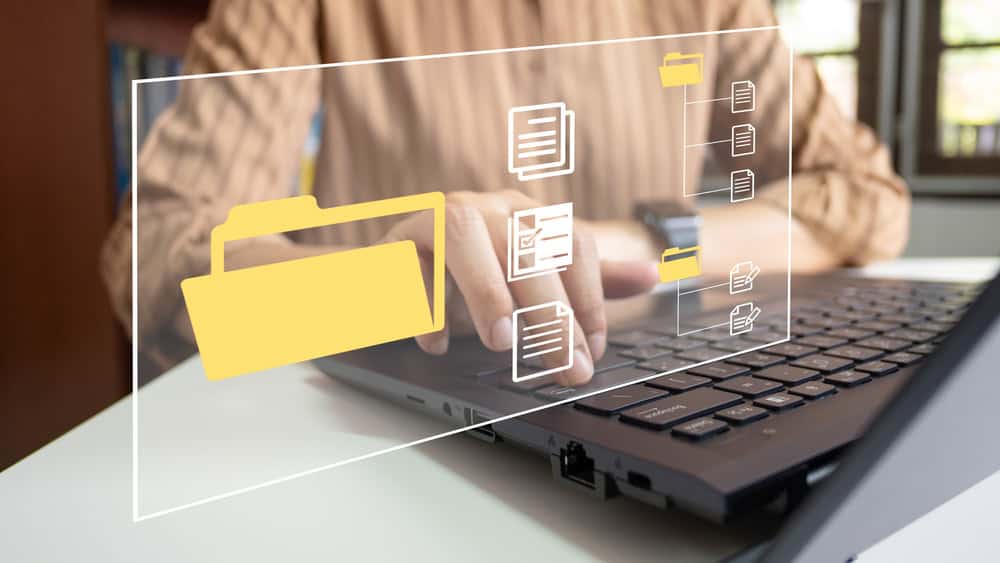 The image depicts a person using a laptop with layered digital folder and document icons, symbolising digital filing and data organisation.