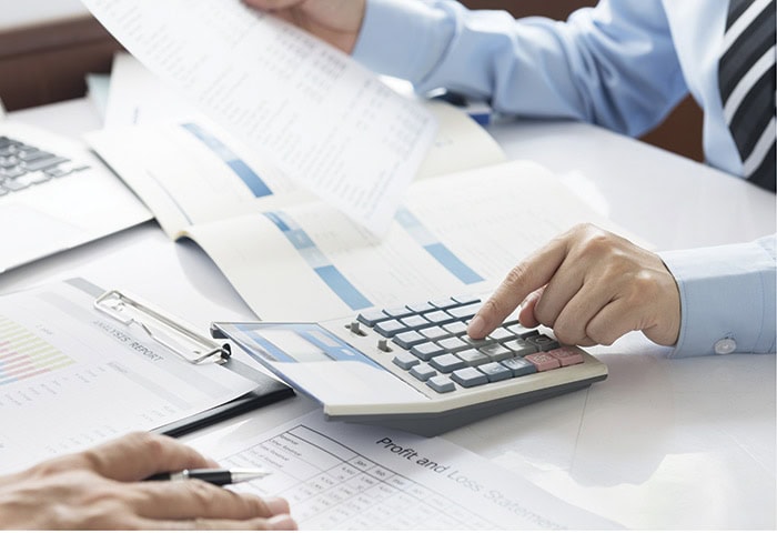 Calculator and financial reports showing business analysis and financial planning for CAJA group investments and growth strategy.