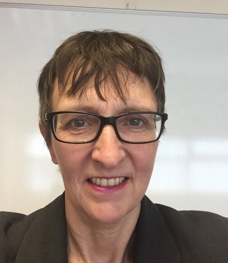 A confident businesswoman with short hair and black glasses, dressed professionally, in a work setting.